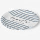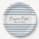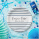 Diseñado para coincidir con el color de nuestra colección de guarderías. El diseño presenta rayas azules y blancas simples pero modernas, un encabezado que dice "Bonjour Bebe", que significa hola bebé, y una línea de texto para personalización.
