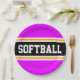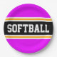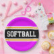 Este diseño deportivo y atlético presenta texto en negrita de SOFTBALL dentro de una banda ancha negra realzada con doble franjas de carreras de naranjas blancas y amarillas contra rayas de fondo rosa brillante. El texto de este diseño se puede personalizar.