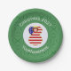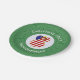 Las placas de fiesta de papel muestran un ángel pelirrojo con la bandera de los Estados Unidos de América para decorar fiestas navideñas o decoración de Navidad. El ángel de la bandera de EE. UU. para Navidad se encuentra dentro de un círculo fractal blanco de cuadrados ondulados. El fondo es de cuadrados ondulados fractales verdes. Agregue su propio texto o personalice con un nombre y el año.