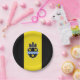 Placa de papel con bandera de la ciudad de Pittsburgh, Pennsylvania; bandera con tres bandas verticales de negro y amarillo con ilustracion de castillo y escudo en el centro