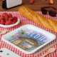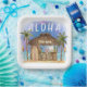 Platos de papel cuadrados con tema Tiki que presentan un bar Tiki de acuarela en la playa bajo la luna y las estrellas con palmeras, luces de cuerda, antorchas Tiki y un saludo de "Aloha". Cócteles tropicales, una piña, hibisco y hojas de palma, una tabla de surf y un loro con sombrero de pirata decoran el área del bar. Perfecto para ducha de parejas, recepción de boda, fiesta de compromiso y celebraciones de aniversario. Arte de KL Stock