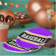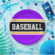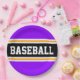 Este diseño deportivo y atlético presenta texto en negrita de BASEBALL dentro de una franja negra amplia resaltada con doble franjas de carreras blancas y amarillas contra rayas de fondo violetas brillantes. El texto de este diseño se puede personalizar.