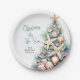 Celebrate the season with this festive and beachy paper plate, perfect for a Christmas By The Sea celebration. The design features a whimsical Christmas tree made of beach shells, starfish, and coral on the right side, adding a fun coastal vibe to your table setup. The palette includes shades of teal blue and tan for a relaxed, breezy feel.