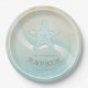 Este plato de papel en los suaves colores del mar y la arena le permite añadir fácilmente su propio nombre y texto usando la plantilla proporcionada. La simple imagen de pez estrella sobre un fondo acuático angustiado se ve resaltada por un estrecho marco blanco y un acento ondulado en agua y blanco. Busque ID623 para ver la coordinación de elementos costeros y productos adicionales con este diseño.