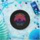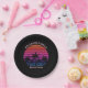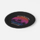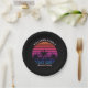 Cool custom beach sunset party paper plates for a destination wedding or family luau on an island. Cute personalized tropical black decor featuring a pretty pink sky behind beautiful palm trees on the coast.