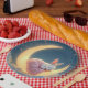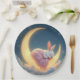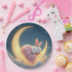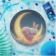 Un esponjoso conejo blanco está envuelto en una manta rosa, descansando tranquilamente en una brillante luna creciente en un cielo nocturno de ensueño. Se puede usar para una ducha de bebé.