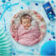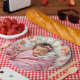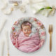 Un dulce plato de papel de bebé con una niña envuelta en blandas mantas blancas y rosas, acurrucadas con su gatito y rodeadas de flores rosadas.