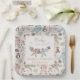 Estos platos de papel Baby Shower neutros en invierno o temporada de fiestas de género incluyen adorables ilustraciones hechos a mano de Navidades de trajes de pijama y animales de felpa en un tendedero y nombre y evento de personalizable. Elegante fondo de marfil.