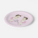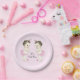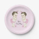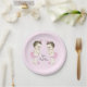 Adorables bebés gemelas con pantalones de volantes y zapatillas de conejito platos para baby shower de gemelas. Estos platos de papel para baby shower de gemelas se pueden personalizar con texto en el estilo de letra y color de su elección, y puede elegir el color de fondo.