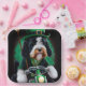 Un amigo peludo detrás de las manillares de una brillante bicicleta verde, usando un traje verde del Día del San Patricio que hace que las cabezas se vuelvan. El perro está vestido con un conjunto festivo, con una corbata verde de arco y un sombrero superior a juego que se sienta cómodos sobre su cabeza. El conjunto presenta un diseño intrincado de rocas de champú y leprechauns, lo que deja claro que este perro está listo para celebrar el Día de San Patricio con estilo.