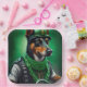 Un amigo peludo detrás de las manillares de una brillante bicicleta verde, usando un traje verde del Día del San Patricio que hace que las cabezas se vuelvan. El perro está vestido con un conjunto festivo, con una corbata verde de arco y un sombrero superior a juego que se sienta cómodos sobre su cabeza. El conjunto presenta un diseño intrincado de rocas de champú y leprechauns, lo que deja claro que este perro está listo para celebrar el Día de San Patricio con estilo.