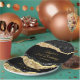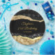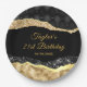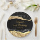Este elegante y glamuroso plato de fiesta de cumpleaños incluye lágrimas de purpurina negro y dorado sobre un fondo negro. El texto combina el guión manuscrito y las fuentes sans serif modernas para un aspecto elegante y sofisticado.