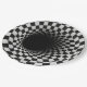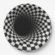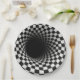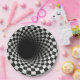 A tunnel-like optical illusion is created using a black and white checkered pattern, giving a dizzying sense of depth