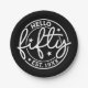 Celebra un fabuloso cumpleaños número 50 con elegantes accesorios fiestas que muestran una atractiva tipografía blanca ambientada con un elegante fondo negro. Con orgullo muestran el mensaje "Hola Cincuenta", invitando a los invitados a unirse a la celebración. Puede personalizar estos elementos aún más añadiendo su año de nacimiento, convirtiéndolos en el único suyo.