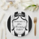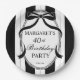 Elegant Black and white retro stripes bow birthday party monogrammed printed paper plates template, adults birthday party personalized name paper plates, stripped birthday party personalized table decor, oval ribbon bow border party printed paper plates, retro birthday personalized tableware, coquette birthday party personalized paper plates