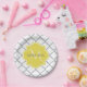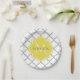 Platos de papel elegantes blancos y grises con patrón de quatrefoil marroquí y una insignia amarilla que puedes personalizar añadiendo tu nombre y monograma inicial. Esto es parte de la colección Quatrefoil de Coconut Milk y Meadowlark Spring.