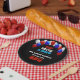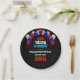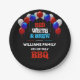Invite a su familia y vecinos a disfrutar de una barbacoa al aire libre el 4 de julio de la familia y ofrecerles estos divertidos y festivos platos de papel del 4 de julio para perros calientes, hamburguesas o verduras a la parrilla. Este diseño presenta globos rojos, blancos y azules en la parte superior. El texto dice ROJO, BLANCO, BREVE y CUARTO DE JULIO. Personaliza con tu apellido por ese toque especial extra.