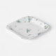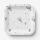 The RUKA Collection blue baby in bloom floral paper plates design features a white background with watercolor flowers like bluebells, hydrangea and forget-me-nots in shades of blue.