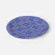 Two images showcase a round plate with a blue geometric and floral pattern. The first image displays the plate from the top, and the second shows it angled.