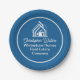 This professional realtor paper plate is custom made with your real estate company name under the modern white cursive script for an open house. This chic blue realty party decor features a house logo image for home builder or realty agent company marketing.