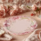 The rounded silhouette and centered negative space give the layout a harmonious flow, allowing the floral border to frame the table setting naturally without overwhelming it. Gold-kissed botanical accents and muted pastel tones add a hint of vintage charm, evoking garden brunches, afternoon tea, and intimate celebrations among friends. The overall palette remains calm and cohesive, blending blush, rose, soft greenery, and warm neutrals for a soothing visual rhythm.