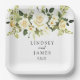 El plato de papel boda se muestra con una bonita impresión floral rosa blanca. Personalizar este elemento y cambia el texto de ejemplo al tuyo. Busque nuestras servilletas de papel y tazas de papel correspondientes. Imprimir con licencia