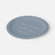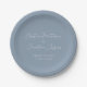 Este evento o plato boda moderno y elegante presenta un fondo azul polvoriento sencillo con texto blanco. Los nombres de la pareja se imprimen en una letra de guión. A continuación se indican la fecha y la ubicación del boda.