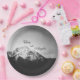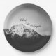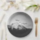 Boda blanco y negro bajo las montañas. Fotografía paisajística de una montaña cubierta de nieve con oscuridad abajo y cielo blanco nublado arriba. Los nombres de la pareja están en letra negra encima de la montaña en el cielo y todos los detalles están en letra blanca debajo de la montaña. Personalizable completo y productos bodas personalizables.