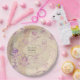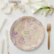 Platos de papel para boda de color lavanda púrpura con decoupage de álbum de recortes vintage diseñados para ser personalizados rápida y fácilmente según los detalles de su evento.