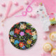 Arte popular mexicano brillante y colorido floral sobre fondo negro.