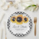 Platos de papel color negro y blanco de gingham y boda de girasol con flores de girasol y luces de cuerda sobre un fondo de gingham. Artículos de juego disponibles para complementar estos platos rústicos de papel boda floral. Fácilmente personalizable para cualquier ocasión.