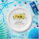 Un arreglo de girasoles amarillos rústicos decora la parte superior de este artículo de plato de papel. El nombre de la novia está escrito en una hermosa letra. Sigue la boda y un corazón amarillo bonito.