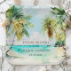 Este elegante y hermoso plato boda acuático cuenta con una playa, un cielo azul y palmeras. El texto combina guiones manuscritos y sans serif para un estilo elegante y moderno. Es perfecto para una boda de verano o destino tropical.