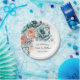 Un impresionante arreglo floral acuático con turquesa, menta oscura, peonías y rosas de melocotón oscuro, bellamente acentuados con elementos diamantíferos y follaje verde profundo. ¡Perfecto para las invitaciones de boda elegantes!