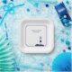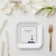 Platos de papel elegantes y sencillos con un ilustracion de faro en tonos azul marino para un boda marino y náutico.