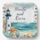 Hermosos platos bodas con faro náutico blanco y negro, pez estrella y conchas. Ideal para un boda. Las palabras se pueden cambiar para adaptarlas a sus propios detalles o requisitos