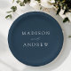 Los elegantes y personalizados platos de papel de boda marino son perfectos para la recepción de bodas, la cena de ensayo, la fiesta de compromiso y mucho más. Los platos minimalistas de boda de la marina son perfectos para bodas de verano, otoño, invierno y primavera. El diseño presenta un guión moderno de caligrafía de moda con sus nombres en letras blancas en un fondo marino. El diseño se coordina con nuestra colección de bodas de la Marina de Elegancia Moderna.
