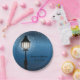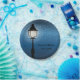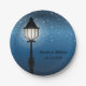 Diseño romántico de placas de papel para boda con un antiguo poste de lámpara de época que resplandece contra un cielo azul nocturno con estrellas. Junto a la luz de la calle del siglo XVIII hay dos áreas de texto de personalizable para la fecha del boda y para los nombres de la pareja que se está casando.