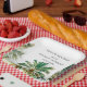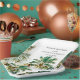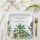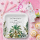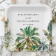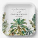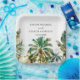 Este elegante y hermoso plato boda acuático cuenta con palmeras tropicales. El texto combina guiones manuscritos y sans serif para un estilo elegante y moderno. Es perfecto para una boda de verano o destino tropical.