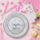 Haz que tu recepción sea aún más bonita con estos platos de papel casero. Diseñadas para coordinarse con nuestra suite Boda de Reflexiones Blancas, cuentan con un borde negro con texto negro sobre un fondo de flores y corazones blancos reflejados. El texto incluye los nombres de la pareja y la fecha de boda.