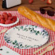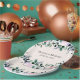 Platos de papel con un bonito diseño floral hecho con acuarelas. Flores de jardín rosadas, moradas y verdes.
