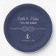 Tema náutico moderno de ancla y cuerda anudada superpuesta en azul marino con tipografía script y moderna para platos de papel para bodas.