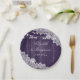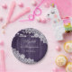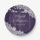 Elegante y romántico plato rústico de papel para bodas moradas inspirado en la madera de granero, encaje floral blanco y luces de cuerda.