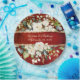 Maravillosos sprays botánicos de flores blancas y verdes con nombres y fechas en escritura en el centro. Scarlet color rojo rústico de fondo angustiado. Purpurina de oro falso para marcar el tono de la elegancia romántica. Las salpicaduras de oro terminan de este plato de papel boda. Hermosos colores y marfil para cualquier temporada.
