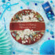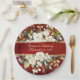 Maravillosos sprays botánicos de flores blancas y verdes con nombres y fechas en escritura en el centro. Scarlet color rojo rústico de fondo angustiado. Purpurina de oro falso para marcar el tono de la elegancia romántica. Las salpicaduras de oro terminan de este plato de papel boda. Hermosos colores y marfil para cualquier temporada.