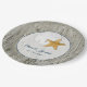 Estos platos rústicos de papel casero en la playa tienen un fondo de madera de maleza, con un dólar de arena y una estrella de mar por encima del nombre de la novia y el novio, y la fecha del boda. Cambie el texto para personalizar el diseño para su día especial. Este diseño náutico costero también es perfecto para otras ocasiones y eventos relacionados con la playa.
