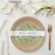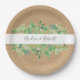 Las hojas de eucalipto verde fresco enmarcan tus nombres en una tipografía elegante sobre un fondo rústico kraft en este moderno plato de papel temático de bodas rurales. Diseñado por Thisisnotme©