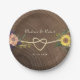 Celebra tu boda rústico con este encantador plato de papel con un fondo de madera falso, un romántico corazón de cuerda y flores acuáticas que incluyen flores de color rubor, vegetación y un girasol brillante. Personalizado con los nombres de la pareja y la fecha de boda, este elegante pero terrenal diseño es perfecto para bodas de granero, recepciones al aire libre o celebraciones por el campo. Ideal para los aperitivos, las mesas de postre o los bufés nupciales.