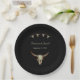 Boda rústico occidental toro cráneo de vaca cráneo negro beige vintage estilo antiguo de la cena platos de papel de recepción. Decoración de la cena de estilo casa de campo antigua con decoración de fondo. Un vaquero del oeste salvaje inspirado. Cuatro cráneos en un patrón con nombre personalizado y guión de fecha. Suministros de moda, frescos, de fiesta animal de granja. Derechos de imagen de Marg Seregelyi Photography.