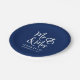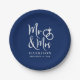 Personalizado placas de papel azul marino para la recepción de su boda y eventos bodas con "Mr & Mrs" escrito en un gran guión blanco y un ilustracion blanco de dos anillos bodas se unieron. Añade tu apellido y fecha de boda.